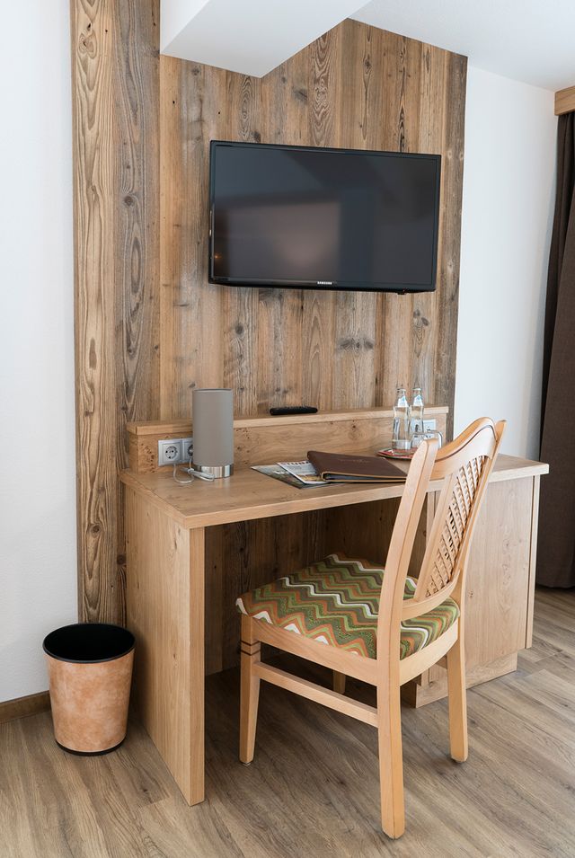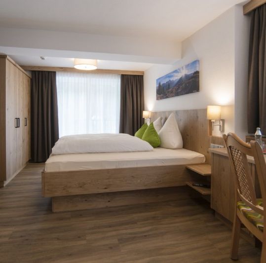 Nuova spaziosa camera in legno naturale in stile rustico moderno con letto matrimoniale in altezza comfort - bagno con doccia, WC, asciugacapelli, Flat-TV con ricezione SAT e TV Stubai, telefono, W-LAN gratuito, cassaforte - la maggior parte con balcone e splendida vista sul ghiacciaio dello Stubai e sul paesaggio montano circostante.